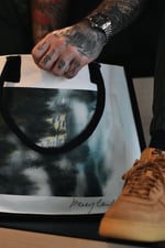 • White canvas tote bag with black handle